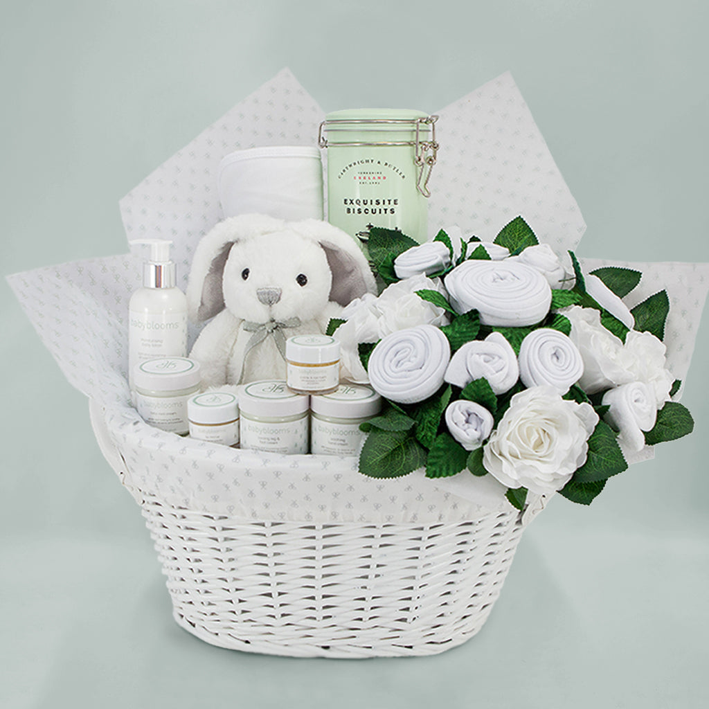The Babyblooms Luxury Baby Clothes Bouquet nestled inside the hamper contains a lovely selection of classic white little clothes, beautifully rolled to resemble a stunning bouquet interspersed with velvet leaves, silk foliage and delicate silk roses, and we have added a tin of luxury biscuits for mum to enjoy with a cuppa. Finally, our super soft snuggly Little Grey Bunny sits proudly in the hamper, ready to give baby a lovely big cuddle.