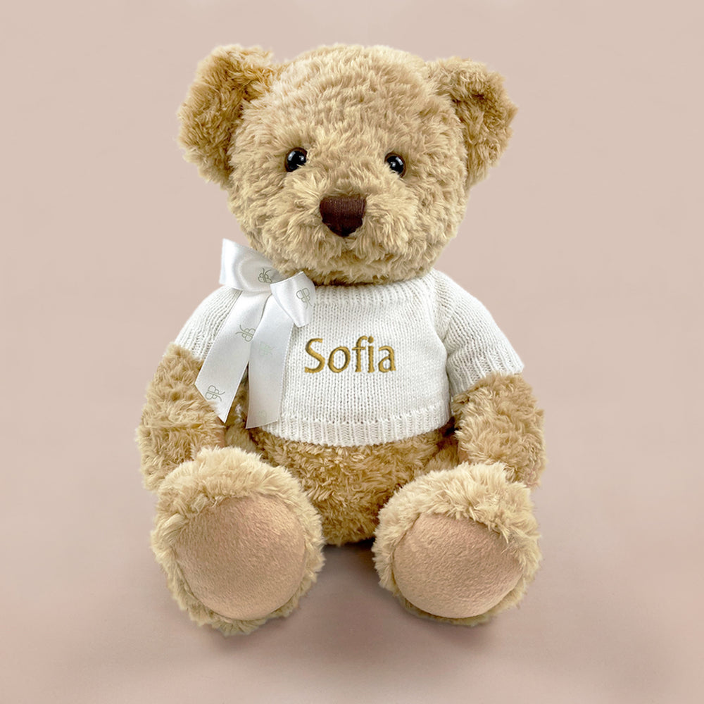 Meet our collection of loveable teddy bears who make snuggable companions for baby boys and girls. For the perfect gift to celebrate a baby shower, a new baby, a christening or even a first birthday these baby teddies will be loved and kept forever. Our teddy bears can be bought individually and come beautifully wrapped in one of our illustrated gift boxes or you can buy a teddy bear gift as part of one of our beautiful gift hampers. Place an order before 3pm for a next day delivery option.
