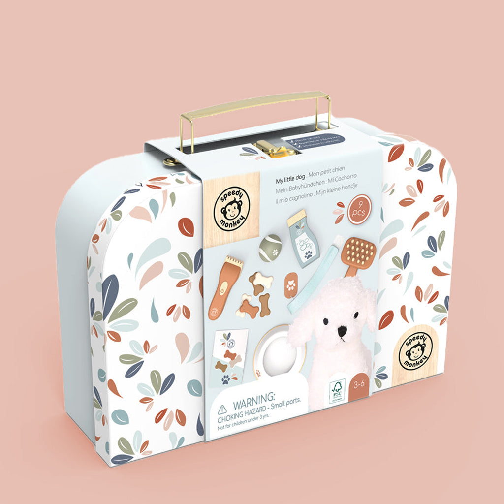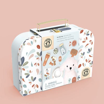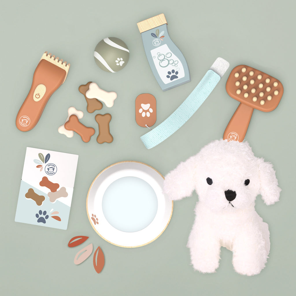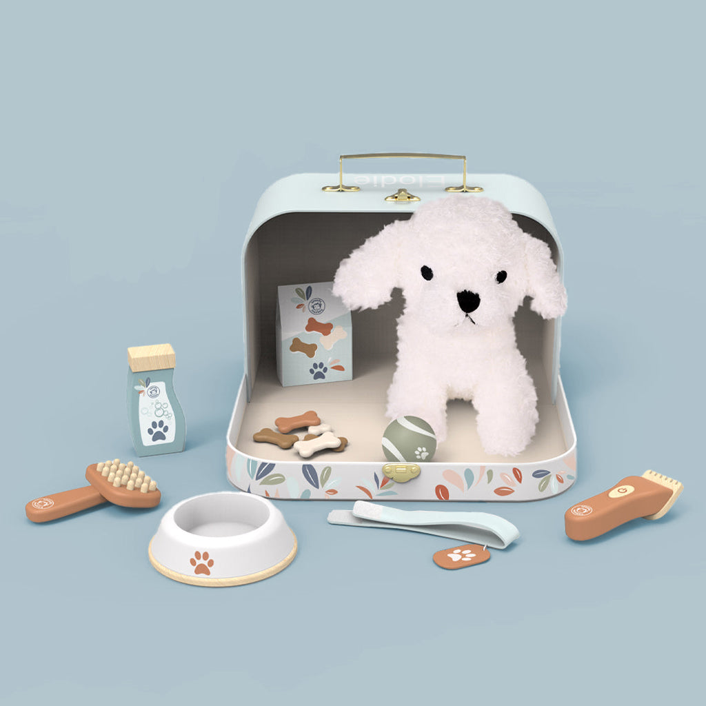 Inside the case, little ones will discover a fluffy white plush dog complete with a collar and name tag, a food bowl, grooming tools, pretend treats, a ball and a pretend bottle of shampoo. Whether brushing, feeding or playing, this adorable set helps to develop empathy, creativity and fine motor skills through everyday pet-care scenarios.
