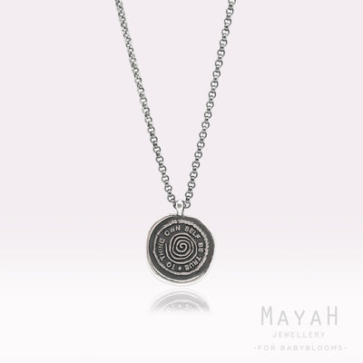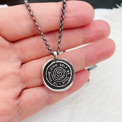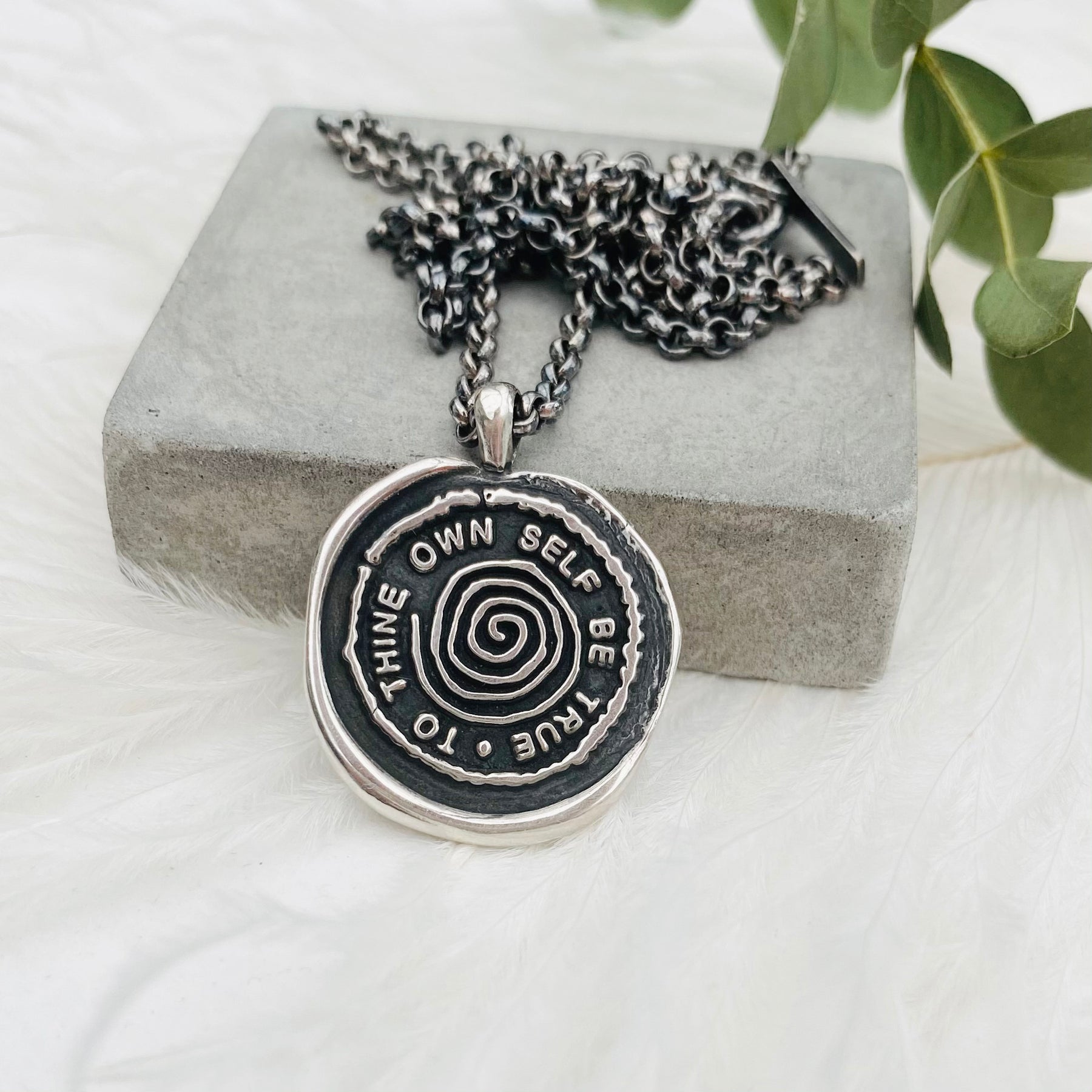 A Talisman medallion pendant in sterling silver, on a beautiful rope chain. A gorgeous piece of jewellery with meaning. The pendant is engraved with a spiral in the centre, symbolic of the journey of self-discovery, encircled with the famous Shakespeare quote "To thine own self be true".