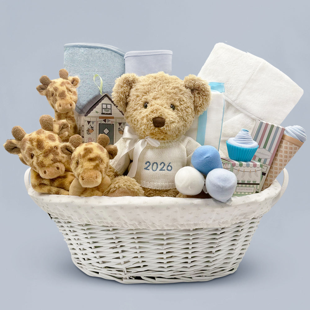 Our trio of giraffe soft toys make the best first friends for baby, and our gorgeous Bernard Bear sits proudly displaying the year that baby was born. Finally, our Ice Cream Bib, Cupcake Socks and trio of Sock-Pops make fun treats for a new baby. All beautifully presented in a luxury lined wicker basket, this hamper is an impressive present for a new mum.