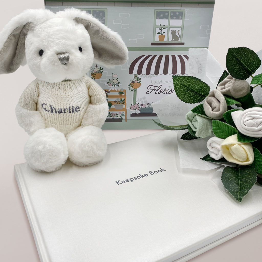 With our beautiful baby clothes posy, personalised cuddly companion and keepsake book for recording all those precious early memories – this gift set is the perfect way to welcome a little one to the world.