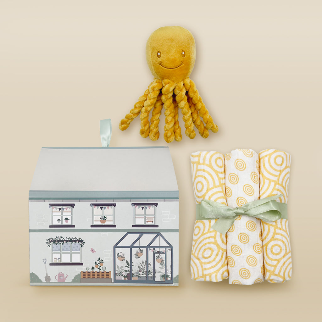 With the delightful Ollie Octopus soft toy and three bamboo and organic cotton soft ribbon tied muslins, this is a wonderful and practical gift for a new baby.