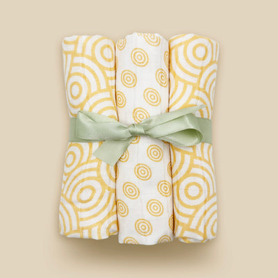 To complete this gift we have added three of our super soft bamboo and organic cotton mix ribbon tied muslins.   Made from 70% bamboo and 30% organic cotton, these are machine washable at 40 degrees.    You can never have enough muslins with a new baby!