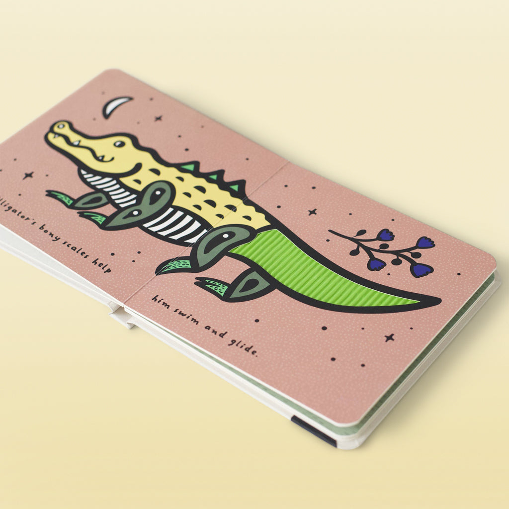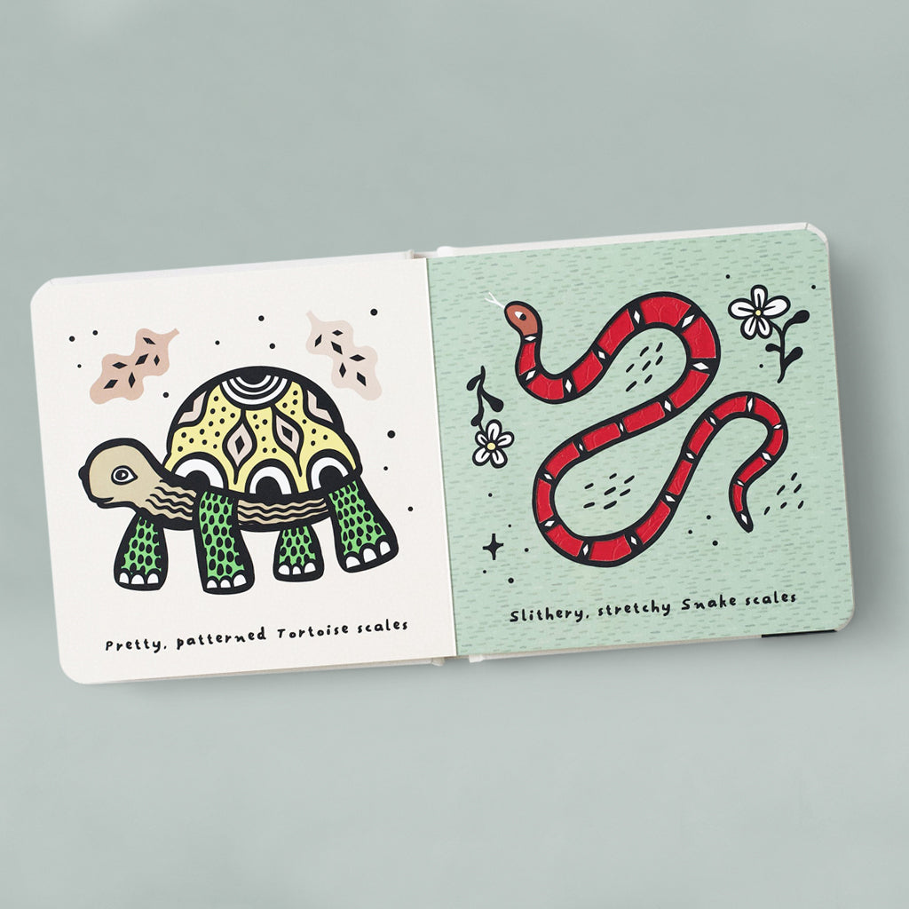 With intriguing textures and materials, meet seven quirky animals from swishy fish to a slithering snake. Designed to help develop sensory and motor skills, this book is sure to capture interest with its striking illustrations and bold colours.