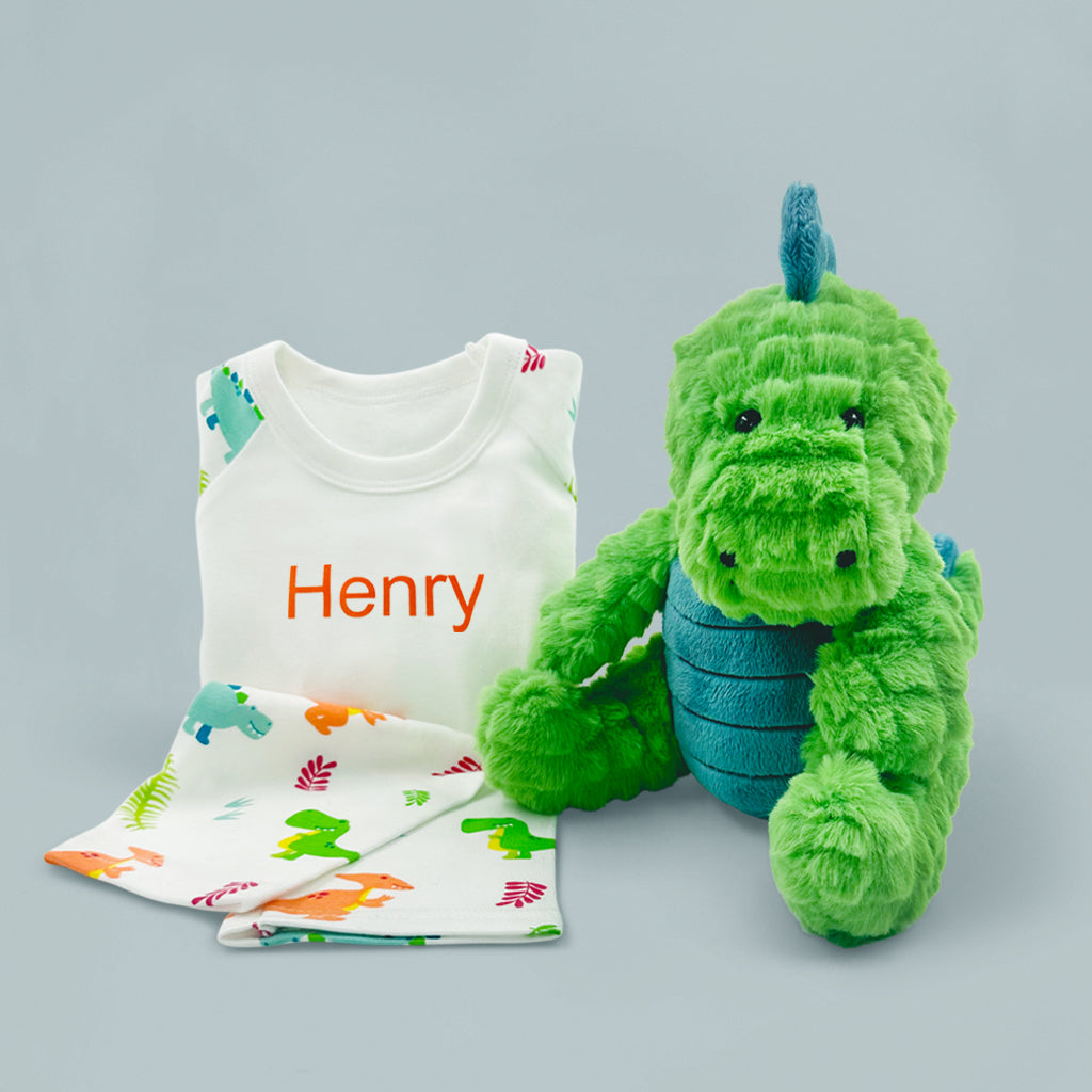 This gift set featuring Steiff's bright and beautiful Spott Stegosaurus Soft Toy, and a pair of Personalised Dinosaur Pyjamas is a thoughtful gift for budding palaeontologists!