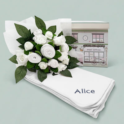 Hand Tied Baby Clothes Bouquet with Personalised Snuggle Wrap, White