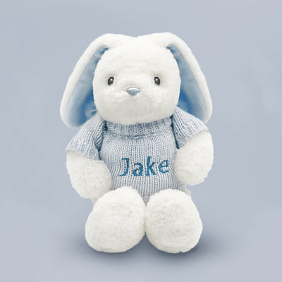 Little Blue Bunny wears a powder blue knitted jumper embroidered with the name of your choice on the front (max 10 characters).   He is part of our EcoToys range and is made using 100% recycled materials.    He is suitable from birth and approximately 24cms high.
