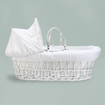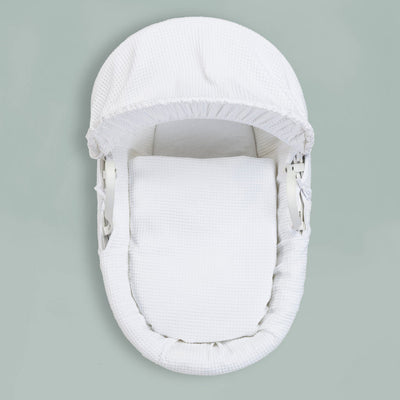 The traditional handwoven white wicker moses basket is made using lightweight & sturdy willow wicker.  Dressed using super soft waffle cotton fabrics that are kind to your baby's delicate skin, it comes complete with detachable, adjustable hood, fibre mattress, coverlet and two white cotton fitted sheets.   A rocking stand is also included to help you rock baby gently to sleep with a forward and backwards motion. Plastic retaining bars ensure that the basket is securely held in place.