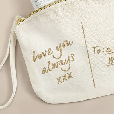 The high-quality canvas pouch features a gold zip and wrist tie, with a choice of two heartfelt illustrations: 'To a Special Mummy' or 'I Leave a Little Sparkle'. Practical as well as pretty, it's the perfect size to use as a cosmetics bag for travel.
