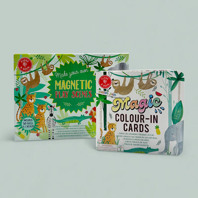 Perfect for on-the-go entertainment, let little minds run wild as they explore this gift set featuring Floss & Rock's Jungle Magic Colour-In Cards and Magnetic Play Scenes!