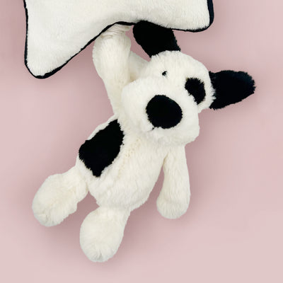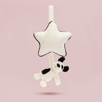 Bashful Black and Cream Puppy is a much-loved Jellycat addition. Accented with sooty black spots, ears, nose and tail, he is made with super soft cream plush. By pulling the cord that attaches the pup to the stylish monochrome trimmed star, it releases a soothing lullaby. Its Velcro strap means it can be easily hung above the cot, and who could resist those puppy eyes?