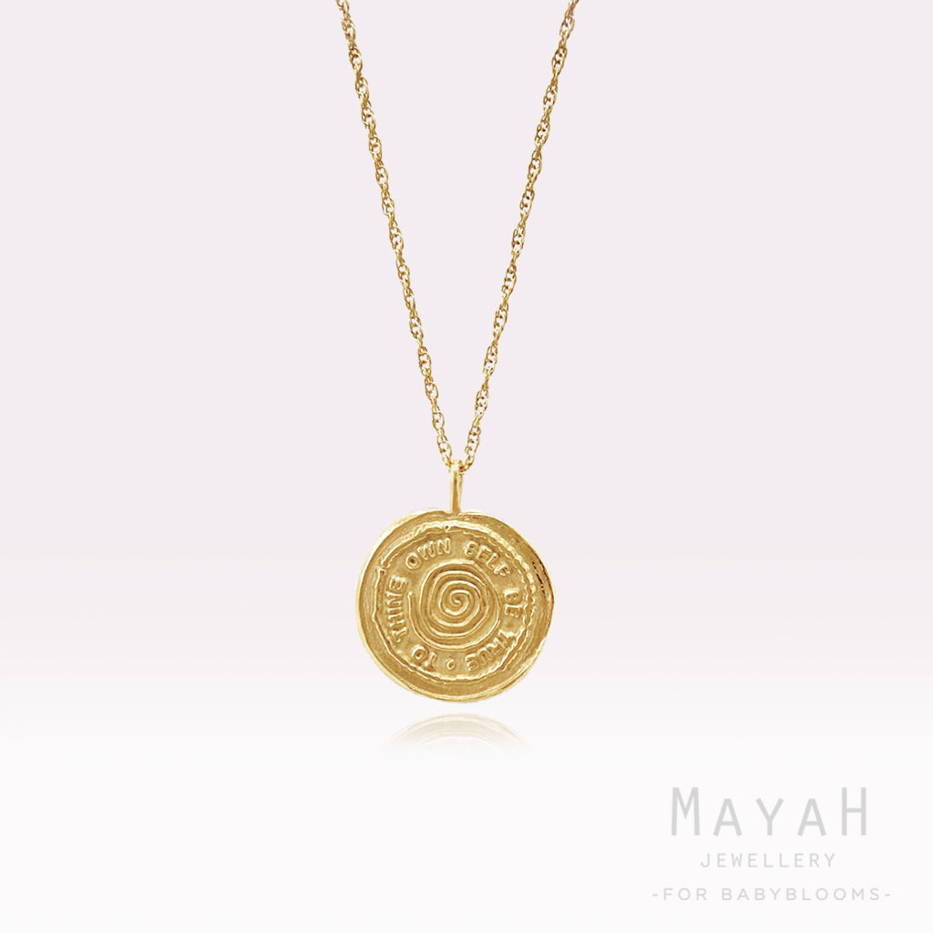 A Talisman medallion pendant in 18ct gold vermeil, on a beautiful rope chain. A gorgeous piece of jewellery with meaning. The pendant is engraved with a spiral in the centre, symbolic of the journey of self-discovery, encircled with the famous Shakespeare quote "To thine own self be true".