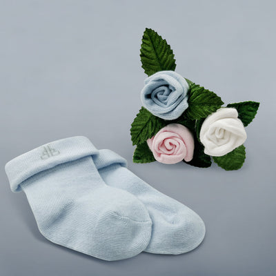 The delightful bear has been paired with three of our Baby Rosebud Socks (2x Pale Blue, 1x White). Made with our fabulous 'stay-on' socks, and interspersed with velvet leaves, they make a fun and practical addition to the gift and are sure to be loved by parents! Each rosebud contains 1x pair of baby socks 0-6m (77% cotton, 23% polymer).