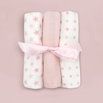 Trio of Ribbon-Tied Muslins Baby Gift, Pink