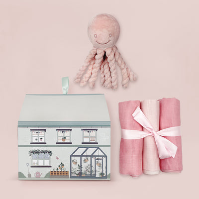 With the delightful Ollie Octopus soft toy and three soft ribbon tied muslins, this is a wonderful and practical gift for a new baby girl.