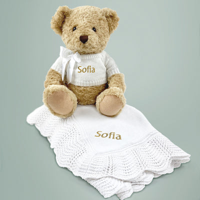 Personalised Christening Gift With Large Teddy Bear And Traditional Blanket