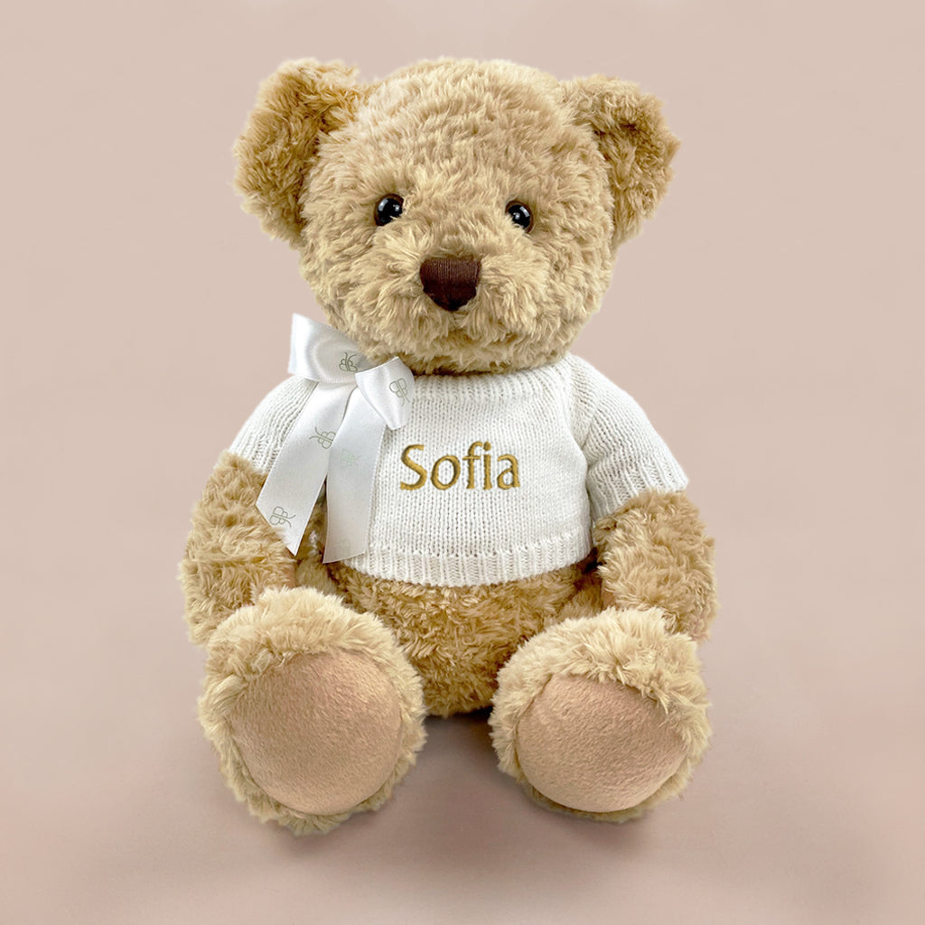 Our very own Bernard Bear is a 28cm traditional style seated teddy bear wearing a subtly embossed white ribbon bow around the neck and a soft white knitted jumper.  He is suitable from birth.   The front of his jumper will be embroidered with a name of your choice (maximum of 10 characters).
