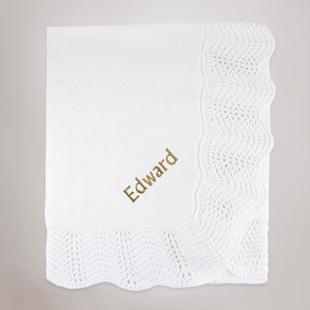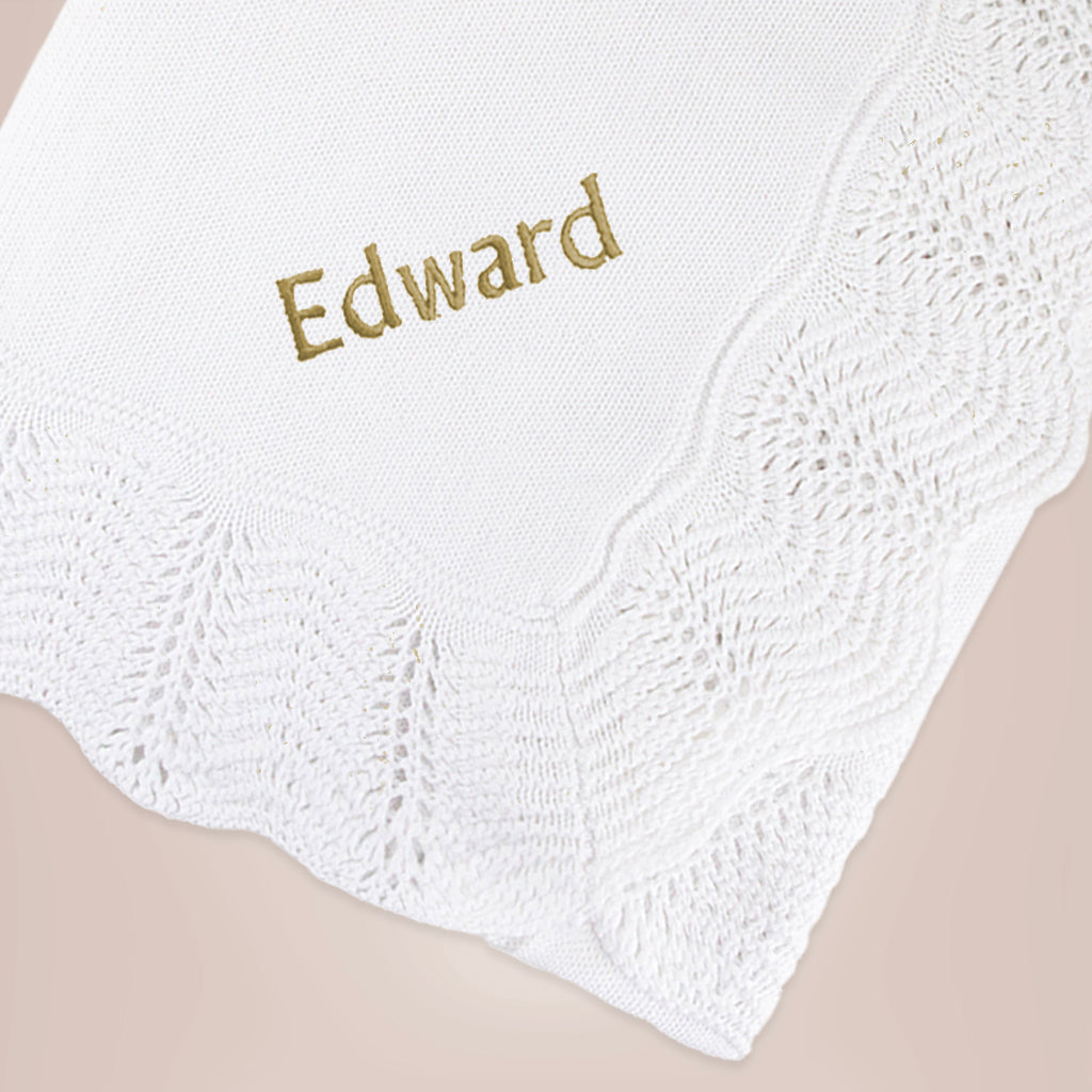 The luxuriously soft textured coat makes this bear an irresistible cuddly companion for a baby as they grow.  Our beautifully soft, 100% cotton blanket with its elegant deep crochet scallop edging is a stylish way to keep baby warm and snuggly on their big day and when personalised with the name of your choice in lovely gold thread, makes a thoughtful and practical choice of gift.