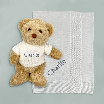 A lovely gift set containing Bertie Bear and a beautifully soft, personalised knitted blanket, perfectly packaged in one of our illustrated gift boxes.