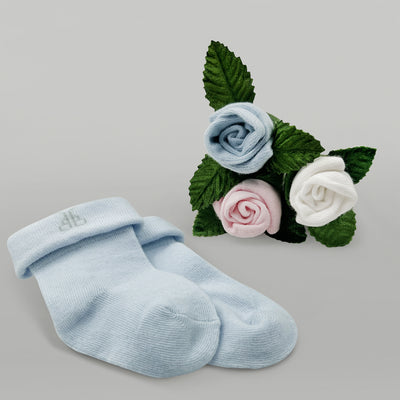 To keep tiny toes cosy, the set includes two pairs of Babyblooms' 'stay-on' socks (one blue, one white, size 0-6m). Renowned for their perfect fit, these socks are cleverly wrapped in cellophane and rolled to look like delicate rosebuds, complete with velvet leaves. Practical, stylish and oh-so cute!