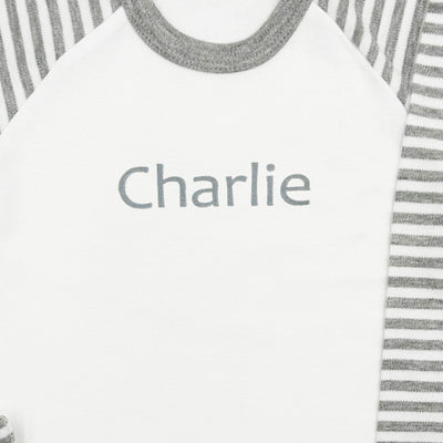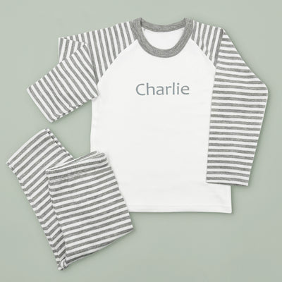 Esme Elephant comes with a pair of our super soft 100% cotton grey and white striped pyjamas.  These can also be personalised with a name of your choice.