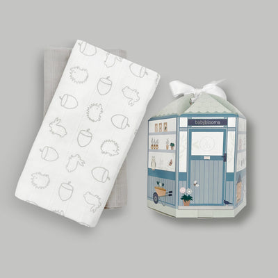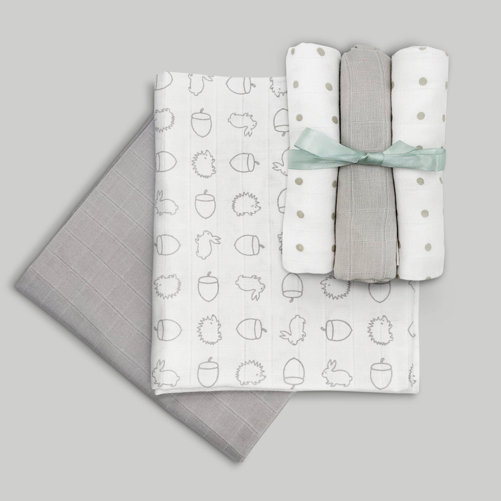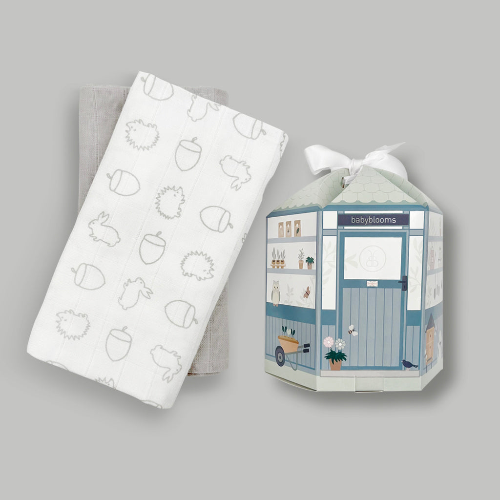 2 x Muslin Swaddles, one with a pretty woodland design featuring acorns, bunnies and hedgehogs and the other in a classic plain soft grey.   Approx 100cm x 90cm.