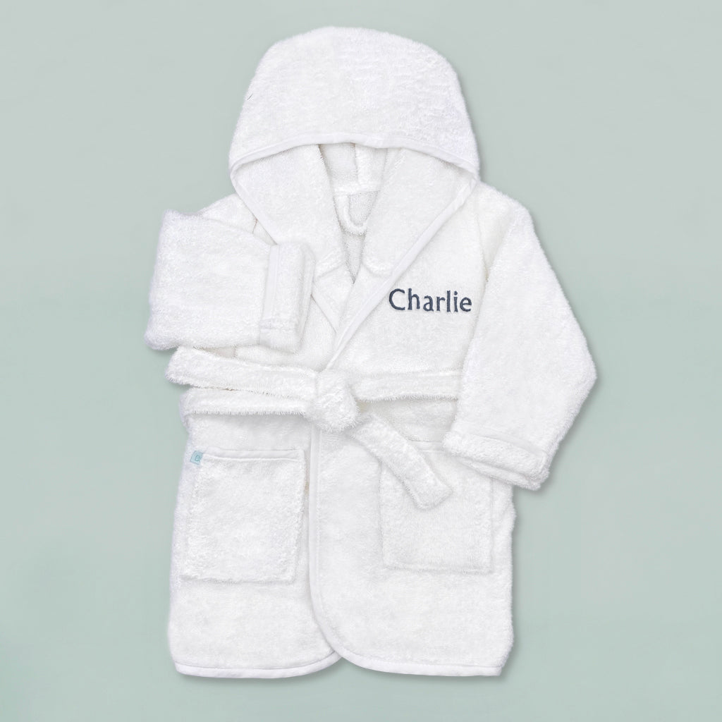 1 x White Bathrobe size 0 – 12 months - 100% cotton embroidered with the name of your choice (maximum of 10 characters).