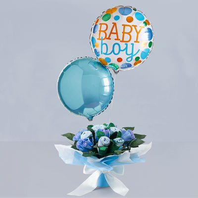 Welcome a new baby boy into the world with a fabulous balloon duo and beautiful Hand Tied Baby Clothes Bouquet!